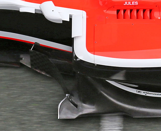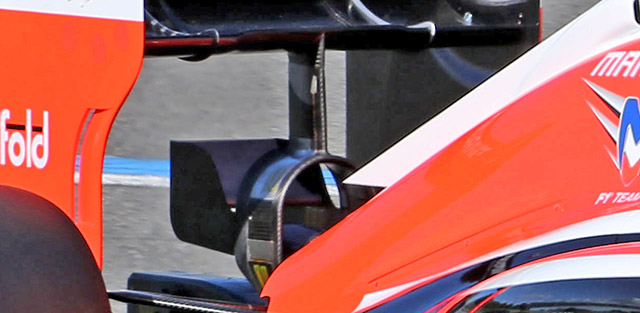The Marussia MR03 has very few aerodynamic details, but there are some around the cockpit including three turning vanes below the wing mirror. Note also the cooling louvers next to the drivers head protection.