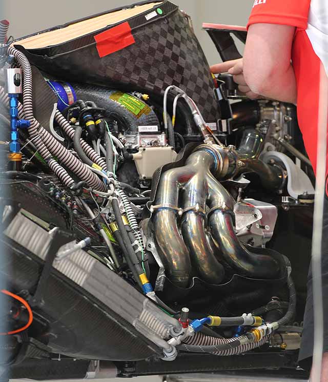 Later in the season the Ferrari V6 engine was upgraded to some extent, and exhaust wrap was added, the absence of which had confounded many engineers at rival engine manufacturers as they felt the lost heat would cost performance overall. Note the turbo cooling pipes fed from the engine cover mounted duct.