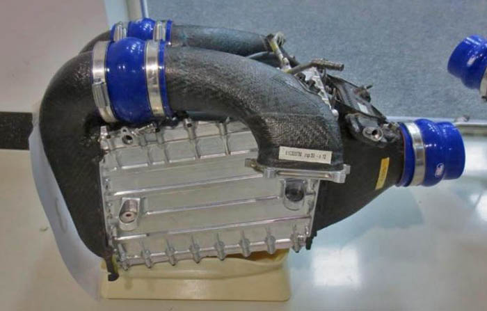 The rear of the cooler layout can be seen in the image above, Â (thanks to @andylaurance for the tunnel model images) while designed in this example for the MNR1 the part is interchangeable with the 2014 version. The upper portion of the duct feeds combustion air rearward to the compressor via the air filter while the lower portion supplies air to the intercooler.
