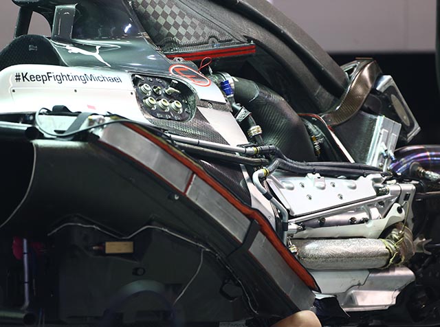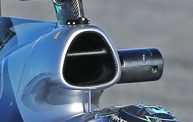 The new Mercedes power unit features a slightly larger plenum compared to the 2014 version, to accommodate the new variable inlet trumpets, something that is claimed not to have caused any great packaging issues. Meanwhile the V6 engine features an entirely new exhaust concept, which seems to have done away with the pulse converter concept seen on last years power unit and adopting a more conventional layout.