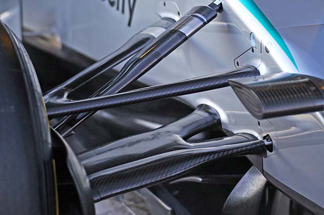 Mercedes has carried over the lower front wishbone concept from the W05 which blends the two legs together in a single shroud, vaguely reminiscent of a Tyrrell design of the 1990’s though that was on the upper wishbone.