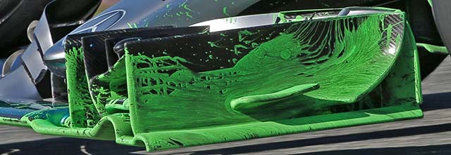 The flow pattern is clear to see on the front wing endplate, which was being evaluated on the opening day of testing.