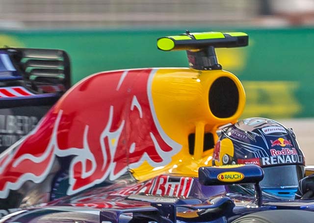 There is additional cooling on the roll hoop of the RB11 (above), the main duct feeds combustion air to the Renault V6 engine. Note the ill fitting engine cover. In concept the roll hoop area largely carries over from the RB10 (below) but the cooling duct below the main duct (and behind the drivers head) has been significantly enlarged.
