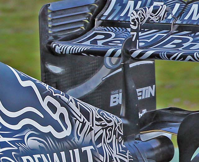 The single pylon rear wing support carries over directly from the RB10, with the DRS actuation passing through the pylon.