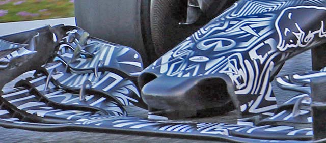 The front bulkhead of the RB11 is fairly large compared to some other 2015 cars. It still features a duct as was the case with the RB10. The entry ducts have been extended from the base of the nose to the side, as can be seen below.