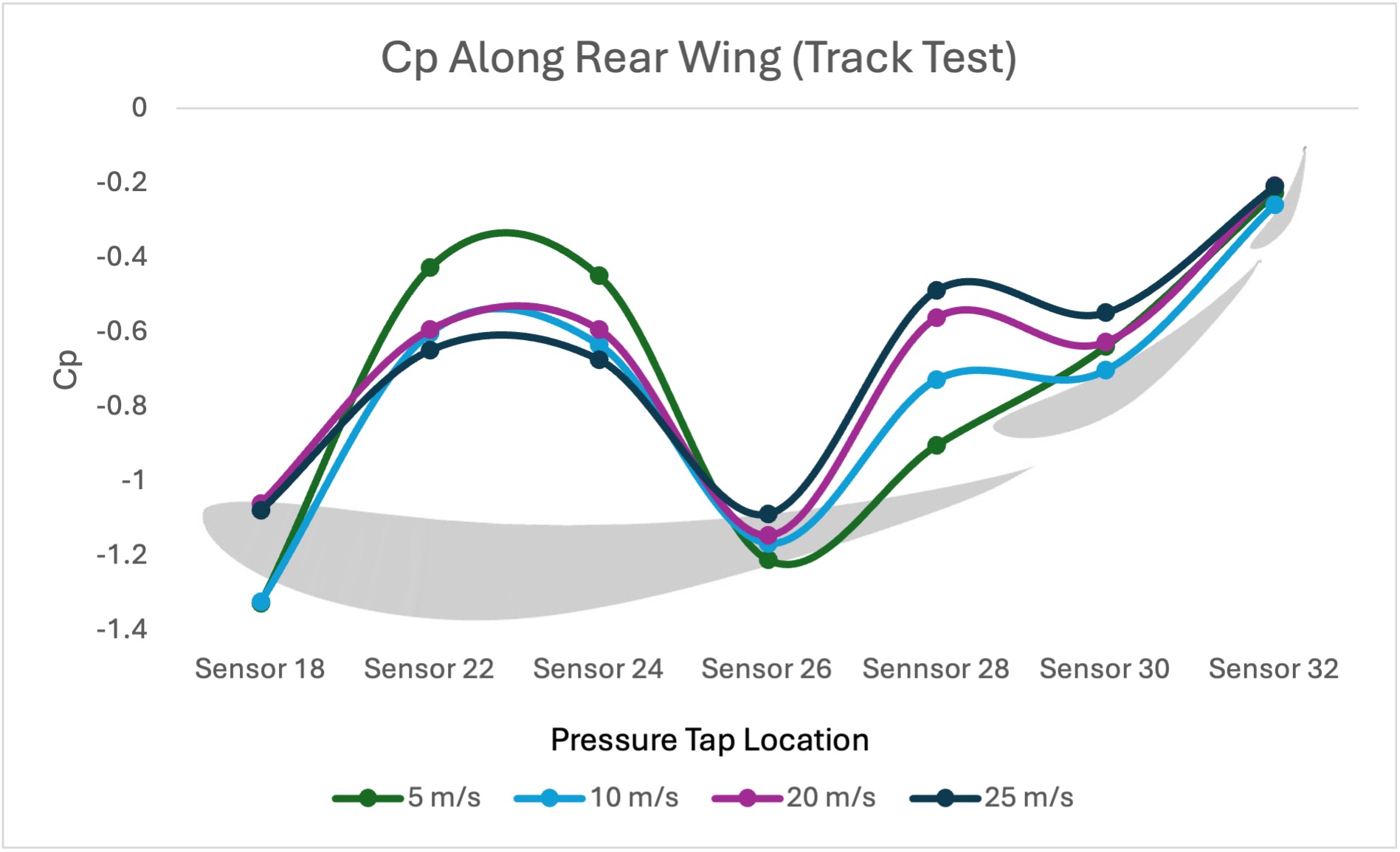 Similarly, the pressure coefficient across the rear wing was also mapped.